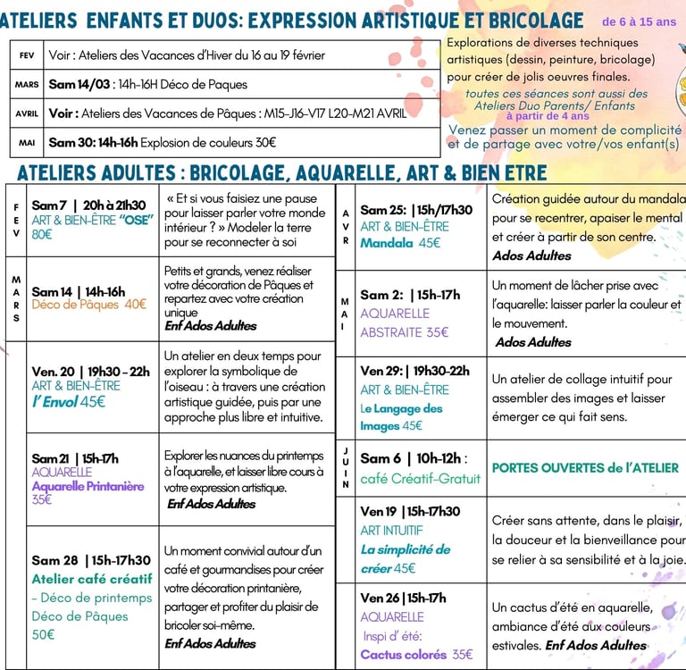 Chaque atelier est une invitation à imaginer, façonner et s’exprimer à travers la couleur, la matière et le dessin.