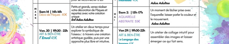 Chaque atelier est une invitation à imaginer, façonner et s’exprimer à travers la couleur, la matière et le dessin.